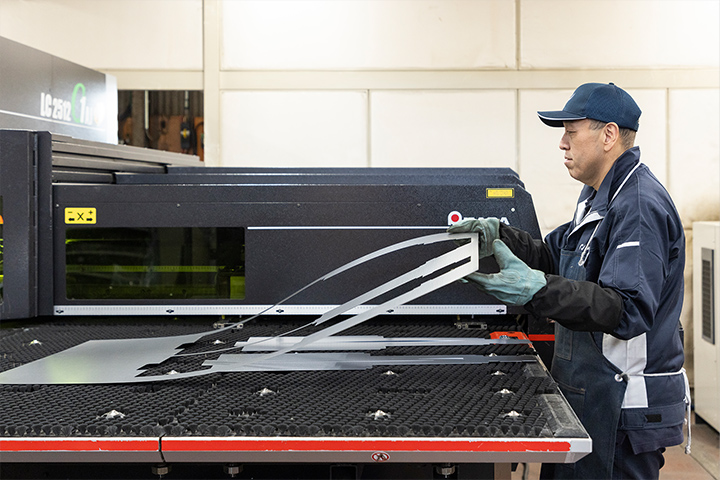 タレットパンチプレスやレーザー加工機を用いて、金属を加工し、必要な部品を取り出します。